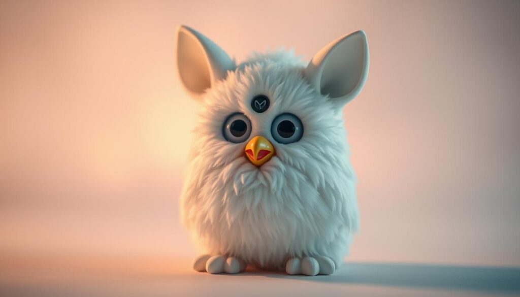 A stunningly detailed white Furby figure, its soft, plush fur illuminated by warm, diffused lighting. The creature sits upright, its oversized eyes and triangular ears capturing a whimsical expression. The foreground is sharply in focus, while the background fades into a hazy, dreamlike realm of muted pastel hues, evoking a sense of tranquility and wonder. The image is captured from a slightly elevated angle, creating an inviting, almost child-like perspective. The overall mood is one of pure delight, capturing the essence of the Furby as an iconic, interactive toy phenomenon.